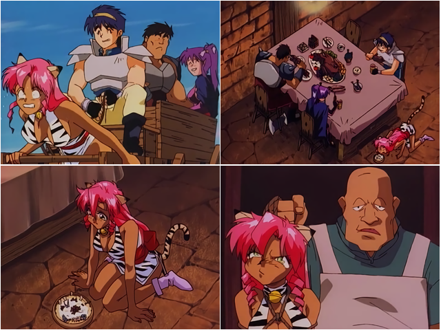 | 핑크는 노예답게 일행을 태운 수레를 직접 끌고 간다. 피어스는 핑크를 불쌍하다고 하면서도 수레에서 내릴 생각은 안함 도중에 퇴치한 몬스터를 두둑한 보수를 얻은 일행은 식당에서 배불리 포식한다. 다들 고기를 뜯는데 핑크만 개밥 신세 그런데, 밥값 계산하려고 보니 산타가 지갑을 분실한 것이었다. 산타는 밥값 대신 핑크를 인질로 맡겨놓고 돈벌러 나감 식당 주인 "내일까지 안오면 이녀석을 팔아치워버릴테다!" |